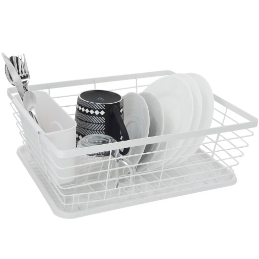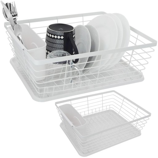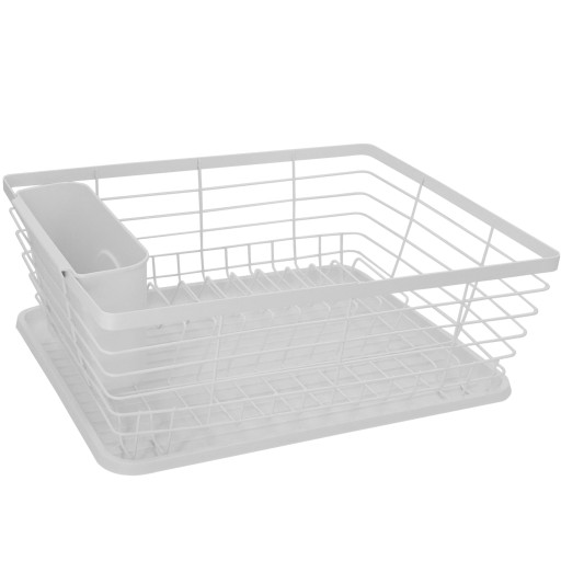 wysoka jakość a także trwała i metalowa konstrukcja. Tacka wykonana z żywicy zabezpiecza blat przed zamoczeniem. Zestaw zawiera również plastikowy, dwukomorowy ociekacz na sztućce. Metalowa biała suszarka jest eleganckim rozwiązaniem do każdej kuchni.