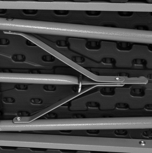 Materiał siedziska to wytrzymały polietylen HDPE. Rama, profile oraz nogi zostały wykonane ze stali malowanej proszkowo. Dodatkowo, nogi ławki posiadają wzmocnienia w postaci wsporników, które po rozłożeniu zabezpieczane są specjalną blokadą. Ławka jest lekka, a po złożeniu w formę walizki zajmuje mało miejsca.