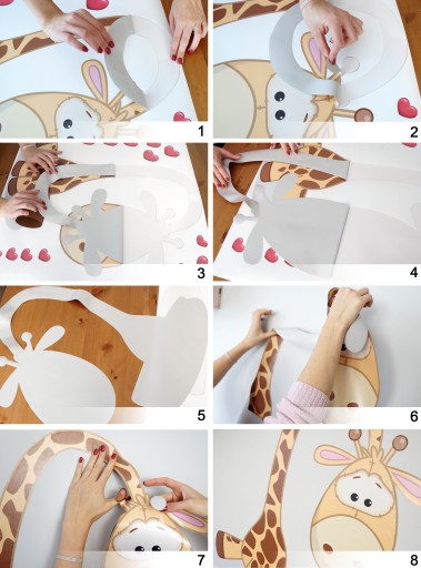 - Gdy trafimy na łącznie się elementów naklejki (tu różki żyrafy) najpierw odklejamy wyższe elementy i dalej odklejamy naklejkę