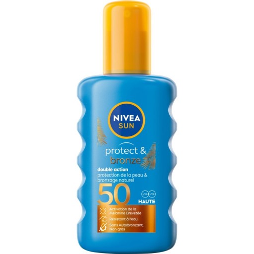 Aktywuj naturalną opaleniznę z balsamem do opalania w sprayu NIVEA SUN Protect & Bronze! Formuła z ekstraktem pro-melanin pobudza naturalne procesy opalania w skórze*, pomagając jej osiągnąć złocisty kolor, bez samoopalacza. Jednocześnie zapewnia wysoką ochronę przeciwsłoneczną SPF50, dzięki zawartości wysoce skutecznego systemu filtrów UVA/UVA. Spray do opalania natychmiastowo chroni przed poparzeniem i uszkodzeniami skóry, wywołanymi przez promieniowanie słoneczne. Łatwo się aplikuje i nie pozostawia n a skórze tłustej warstwy, a dodatkowo jest wodoodporny, aby zapewnić bezpieczeństwo także podczas kąpieli.*potwierdzone w badaniu in vitro