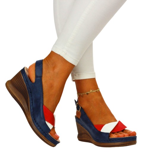 Damskie sandały w kolorze niebieskim z białymi i czerwonymi detalami na wysokim koturnie. Idealnie sprawdzą się jako obuwie na co dzień w letnie, upalne dni. Dopasują się również do eleganckich stylizacji. Zapięcie na sprzączkę ułatwia dopasowanie obuwia do stopy. Profilowana, skórzana wkładka zapewnia komfort użytkowania a szyte spody zwiększają wytrzymałość obuwia.