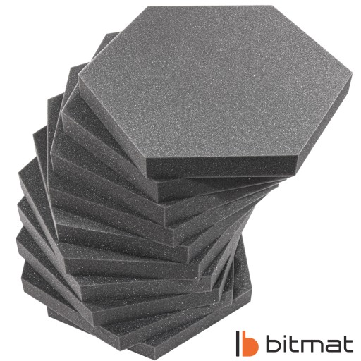Pianka akustyczna heksagon marki Bitmat zwana także panelem akustycznym jest wykonywana ze spienionego poliuretanu, a jego struktura to otwarte komórki. Zastosowanie odpowiedniego materiału doskonale sprawdza się w studiach i pokojach muzycznych/kabinach lektorskich, ponieważ poprawia zrozumiałość mowy i wokalu. Jest to zastosowanie optymalne, które przy stosunkowo niskich kosztach pozwala zapobiegać pogłosowi, poprawia jakość dźwięku w pomieszczeniach mieszkalnych i roboczych, a także tworzy nowoczesny design.