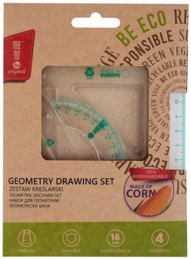Czteroelementowy ekologiczny szkolny zestaw kreślarski MemoBe w etui, stworzony w trosce o przyszłość naszej planety oraz ograniczenie produkcji i użycia plastiku.