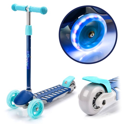 Hulajnoga dla dziecka ze świecącymi kółkami. Regulowana kierownica. Manewrowanie będzie łatwiejsze, dzięki użyciu trójkołowej konstrukcji. Absorbery pochłaniające energię uderzenia kierownicy o podłoże. Wszystkie śruby łączące oraz zabezpieczające stworzono ze stali.