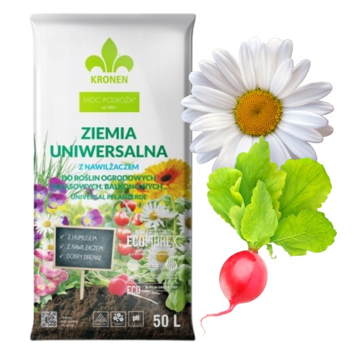 ☘️KRONEN® Ziemia uniwersalna z nawilżaczem jest przeznaczona do sadzenia i przesadzania wielu gatunków roślin zielonych i kwitnących, warzyw, ziół, bylin, iglaków w domach na balkonach, tarasach i w ogrodach, z wyjątkiem roślin kwaśnolubnych.