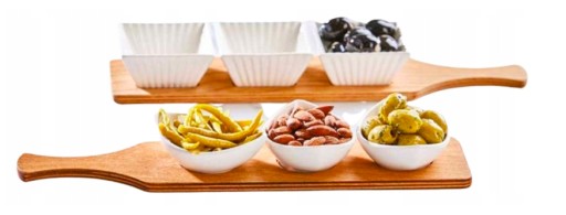 - zestaw 3 ceramicznych miseczek do serwowania dipów i przekąsek na podkładce z drewna bukowego,