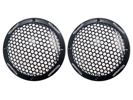 2 solidne maskownice ochronne z otworami Hexagon na głośniki Excursion o średnicy 200mm (8 cali) - metalowa maskownica, metalowy pierścień z logo, kolor czarny.