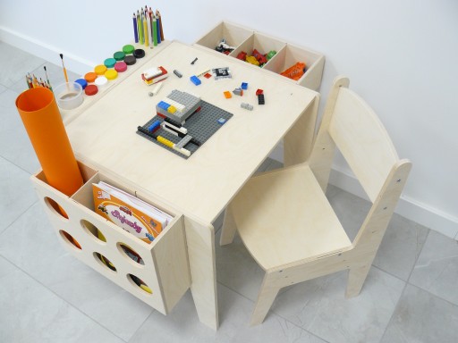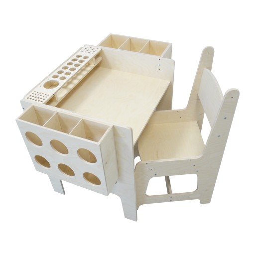 Komplet składa się ze stolika, krzesełka oraz trzech organizerów. Wykonany został ze sklejki nie pokrytej lakierem. Zarówno stolik jak i krzesełko posiadają trzy poziomy regulacji: starszak, junior i junior plus. W zestawie znajdują się organizery, które przeznaczone są na farby, pędzelki, kubki na wodę, kredki, flamastry i długopisy, kartki papieru oraz klocki. Dzięki nim nie trzeba sięgać za każdym razem do szuflady czy piórnika - wszystko jest dostępne w zasięgu ręki. Nasze sortery mogą być wykorzystywane podczas zabawy - rysowania lub malowania przez dzieci. Pojemniki są stabilne i praktyczne w użytkowaniu, a ich solidne wykonanie pozwoli na długotrwałe używanie. Każdą kredkę można włożyć do osobnego otworu, dzięki czemu dziecko z łatwością wyjmie i włoży kredkę na swoje miejsce.Komplet doskonale uzupełni umeblowanie pokoiku Twojego dziecka sprawi, że jego wnętrze stanie się ciepłe i radosne. Mebelki są funkcjonalne i nie zajmują dużo miejsca. Krzesełko jest bardzo wygodne, a stolik zapewnia wystarczającą ilość miejsca do zabawy. Twoja pociecha odnajdzie przy nim doskonałe miejsce do zabawy, rysowania i malowania, a nawet spożywania posiłków.