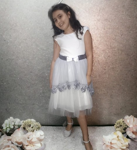 Sukienka ma bawełnianą podszewkę, jest bardzo rozkloszowana, z szarym tiulem i haftowanymi elementami. W pasie wiązana. Z tyłu zapinana na zamek.