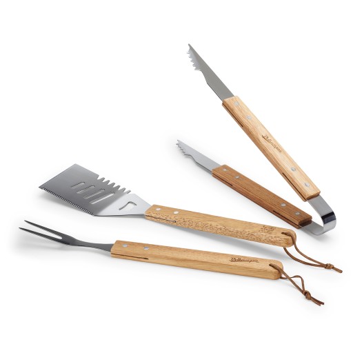 Trzyczęściowe sztućce do grilla wykonane z polerowanej stali nierdzewnej. Zestaw obejmuje: łopatkę, widelec do mięs i szczypce do grillowania. Łopatka do grillowania z ząbkowanym ostrzem do cięcia i otwieraczem do butelek. Drewniane uchwyty zdobi wytłoczenie Volkswagen