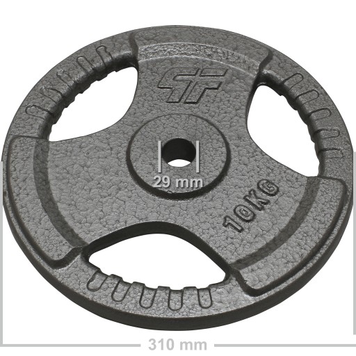 Żeliwne talerze o konstrukcji Tri-Grip, która pozwala na szybką zmianę na sztandze lub gryfie