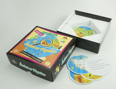 - Gra zawiera 30 okrągłych kart z rysunkami związanymi z wiedzą o świecie.