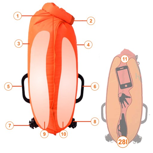 Boja pływacka do pływania z asekuracją na wodach otwartych jak np. jeziora, morze itp. Boja wyposażona jest w tak zwaną suchą kieszeń, w której można umieścić przedmioty osobiste jak np. ręcznik, ubrania na zmianę, dokumenty i inne. Kieszeń przy prawidłowym zamknięciu jest całkowicie szczelna. Produkt przeznaczonym dla osób, dla których bezpieczeństwo w wodzie jest absolutnym priorytetem.