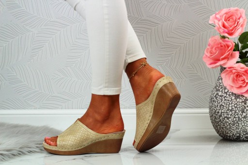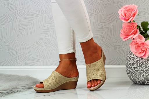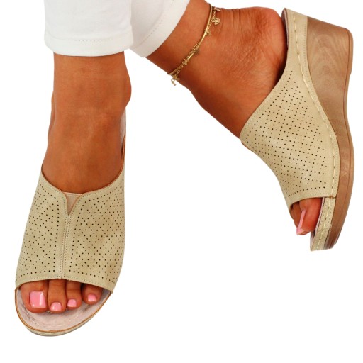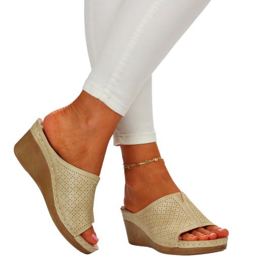 Damski klapki w kolorze beżowym na koturnie. Idealnie sprawdzą się jako obuwie na co dzień w letnie, upalne dni. Profilowana, skórzana wkładka zapewnia komfort użytkowania a szyte spody zwiększają wytrzymałość obuwia.