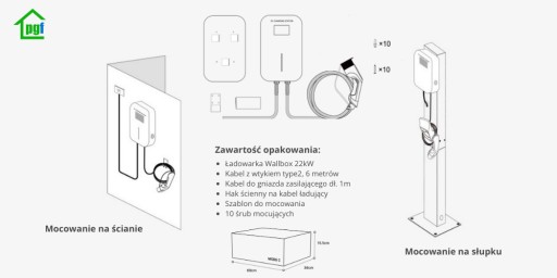 - Łatwa instalacja - w zestawie z ładowarką znajduje się wszystko co niezbędne do szybkiej instalacji ładowarki na ścianie lub słupku.