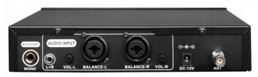 Drugą część systemu stanowi nadajnik fal radiowych o zakresie częstotliwości od 518 do 542 MHz. Na tylnej części jego obudowy znajdują się dwa wejścia typu combo – XLR/Jack dla lewego (L) i prawego (R) kanału wraz z obrotowymi potencjometrami głośności, wejście typu jack (1/4”), gniazdo do podłączenia zasilacza (w zestawie) oraz złącze antenowe BNC. W części przedniej mieści się przełącznik zasilania, gniazdo słuchawkowe z potencjometrem głośności, oraz panel sterowania wyposażony w przyciski Up, Down, Set i czytelny wyświetlacz LCD. Pokazuje on aktualne parametry systemu monitorującego dźwięk, takie jak poziom jakości sygnału, ustawienie częstotliwości pracy zestawu czy wybrany kanał przesyłania danych.
