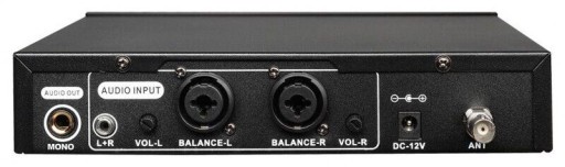 Drugą część systemu stanowi nadajnik fal radiowych o zakresie częstotliwości od 518 do 542 MHz. Na tylnej części jego obudowy znajdują się dwa wejścia typu combo – XLR/Jack dla lewego (L) i prawego (R) kanału wraz z obrotowymi potencjometrami głośności, wejście typu jack (1/4”), gniazdo do podłączenia zasilacza (w zestawie) oraz złącze antenowe BNC. W części przedniej mieści się przełącznik zasilania, gniazdo słuchawkowe z potencjometrem głośności, oraz panel sterowania wyposażony w przyciski Up, Down, Set i czytelny wyświetlacz LCD. Pokazuje on aktualne parametry systemu monitorującego dźwięk, takie jak poziom jakości sygnału, ustawienie częstotliwości pracy zestawu czy wybrany kanał przesyłania danych.