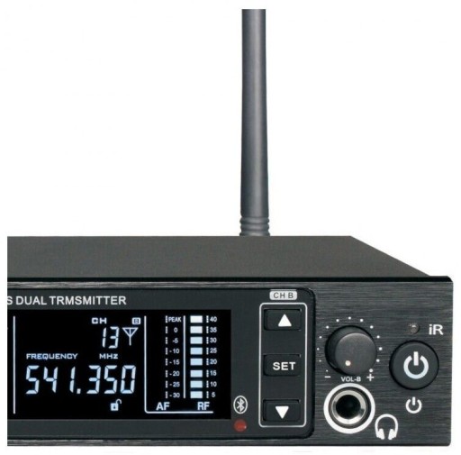 Drugą część systemu stanowi nadajnik fal radiowych o zakresie częstotliwości od 518 do 542 MHz. Na tylnej części jego obudowy znajdują się dwa wejścia typu combo – XLR/Jack dla lewego (L) i prawego (R) kanału wraz z obrotowymi potencjometrami głośności, stereofoniczne wejście typu jack (6,3 mm), gniazdo do podłączenia zasilacza (w zestawie) oraz dwa złącza antenowe BNC. W części przedniej mieści się przełącznik zasilania, dwa gniazda słuchawkowe z potencjometrami głośności oraz panel sterowania wyposażony w przyciski Up, Down, Set i czytelny wyświetlacz LCD. Pokazuje on aktualne parametry systemu monitorującego dźwięk, takie jak poziom jakości sygnału, ustawienie częstotliwości pracy zestawu czy wybrany kanał przesyłania danych.