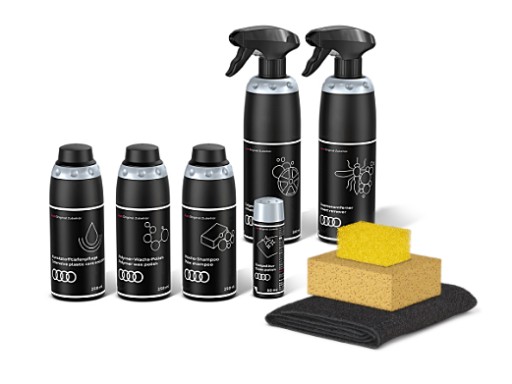 Torba z czarnego nylonu ze środkami pielęgnacyjnymi wysokiej jakości zawiera wszystko, co potrzebne do gruntownego czyszczenia i wykończenia wyczyszczonych powierzchni.