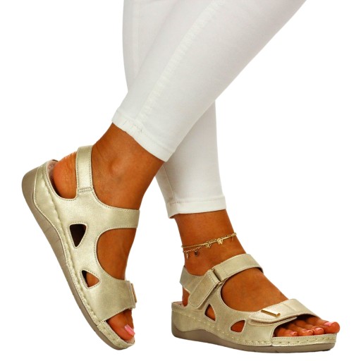 Damskie sandały w kolorze beżowym na niskim koturnie. Idealnie sprawdzą się jako obuwie na co dzień w letnie, upalne dni. Paski na rzepy ułatwiają zakładanie obuwia oraz dopasowanie go do stopy. Profilowana, skórzana wkładka zapewnia komfort użytkowani a szyte spody zwiększają wytrzymałość obuwia.