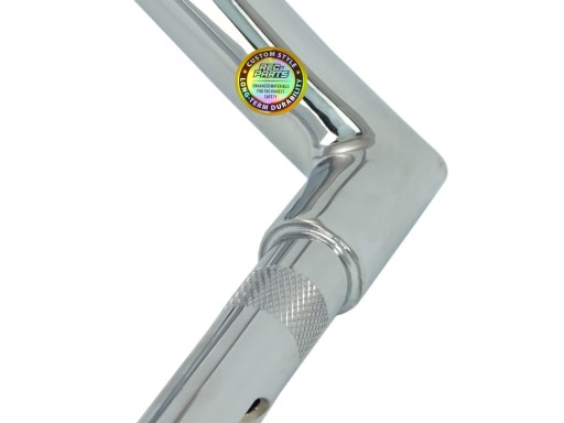 Standardowa 1-calowa grubość (25,4 mm) w miejscu montowania manetek pozwala na montaż manetek do wszystkich motocykli o kierownicach calowych (większość kierownic w motocyklach Harley oraz w motocyklach typy chopper), pozostała część kierownicy poszerzana jest do 32 mm (poza dolną częścią mocowania). Niebieską strzałką wskazana jest zatyczka ochronna na kierownicę (przy montażu manetek neleży zdjąć zatyczkę). Czerwoną strzałką wskazany jest otwór na okablowanie.