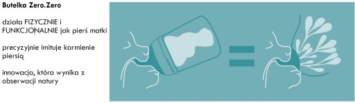 Innowacyjne butelki Zero Zero posiadają wewnętrzną, silikonową torebkę. Ta opatentowana torebka silikonowa, w czasie karmienia jest rozciągnięta w zależności od tego, jak dziecko ssie, podobnie jak to dzieje się w gruczołach mlecznych u kobiety karmiącej. Ten innowacyjny system powoduje brak pęcherzyków powietrznych w pokarmie, zatem dziecko nie połyka powietrza, które mogłoby spowodować kolkę. System ten zapobiega także utlenianiu się mleka i utracie ważnych składników odżywczych.