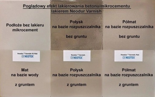- NEODUR VARNISH W - lakier do zabezpieczania posadzek żywicznych, betonowych, mikrocementowych oraz cegieł. Odporny na promieniowanie UV - nie żółknie. Dostępny w trzech rodzajach wykończenia: Mat (matowe), Satine (satynowe) i Gloss (połysk). Produkt bezrozpuszczalnikowy.