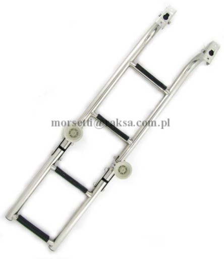 Drabinkę można przykręcić do burty, lub górne uchwyty umieścić na pokładzie a stopki oprzeć o burtę. Górne uchwyty są przystosowane zarówno do montażu na stałe (przykręcamy je za pomocą czterech śrub M5 do łodzi), jak i do montażu umożliwiającego swobodne i szybkie odczepianie drabinki (do łodzi przyczepiamy dwie śruby M8, na których zatrzaskujemy drabinkę)