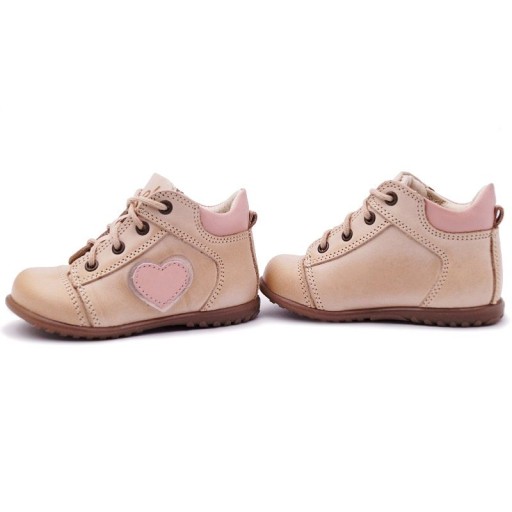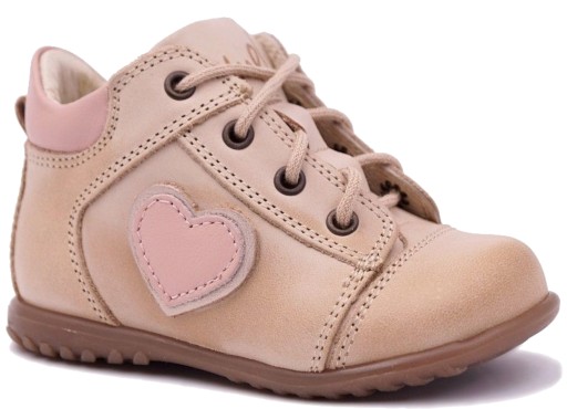 Śliczne buciki dziewczece firmy Emel z serduszkiem. Wykonane w całości z wysokiej jakości skóry naturalnej, dzięki której delikatne nóżki maluszka mają zapewnioną zdrową wentylację oraz nie powoduje otarć