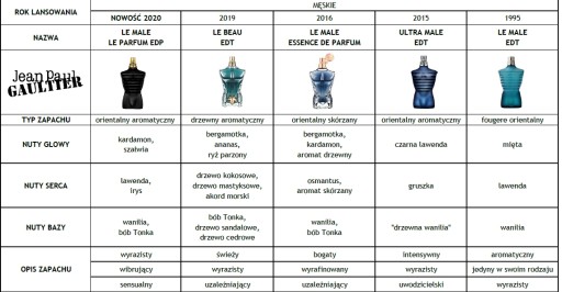 Przyprawy jakie tworzą zapach Jean Paul Gaultier Le Male to kardamon, cynamon, kminek rzymski, wanilia oraz ambra.