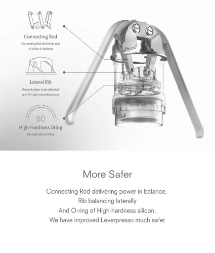 Leverpresso jest ekspresem trzeciej generacji i posiada ulepszony system dźwigni. Nowy system dźwigni zawiera teraz zintegrowaną tuleję, aby zmniejszyć tarcie, wydłużyć żywotność produktu i zapewnić gładsze doświadczenie ekstrakcji espresso. Dodatkowo, półmatowa powierzchnia ekspresu pomaga zwiększyć odporność na zarysowania.