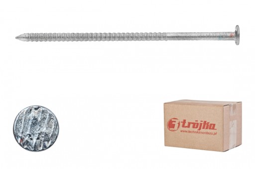 Gwoździe Pierścieniowe Ocynkowane TRÓJKA wykonane są z twardego metalu trzpień zaostrzony z jednej strony, z drugiej zakończony płaskim łbem. Gwóźdź służy do produkcji palet, więźb dachowych, do elementów wymagających dużej wytrzymałości. Połączenie jest utrzymywane dzięki siłom tarcia działającym wzdłuż osi gwoździa oraz dzięki sztywności trzpienia.Gwoździe wykonywane są ze stalowego drutu najwyższej jakości, a dzięki powłoce galwanicznej żywotność gwoździa jest bardzo długa w warunkach atmosferycznych. PARAMETRY: