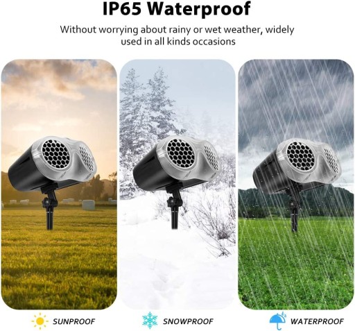 - Zarówno lampa, jak i wtyczka są wykonane z wysokiej jakości tworzywa ABS i są wodoszczelne z klasą ochrony IP65 (światło) i IP44 (wtyczka). Temperatura robocza projektora LED w kształcie płatka śniegu od -20°C do 50°C nadaje się również do użytku na zewnątrz, nawet w przypadku deszczu, śniegu lub wilgoci. Odporna na warunki atmosferyczne, szeroko rozpowszechniona na wszystkie okazje.