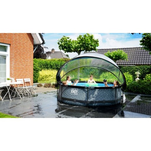 Kopuła basenowa EXIT pasuje do stelażowych okrągłych basenów EXIT o średnicy 300 centymetrów i do basenów innych marek* o średnicy od 300 do 310 centymetrów.