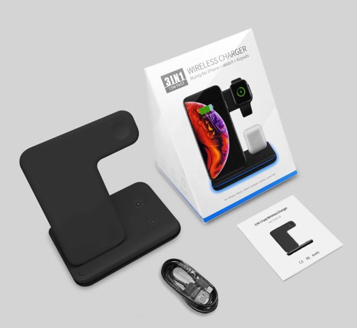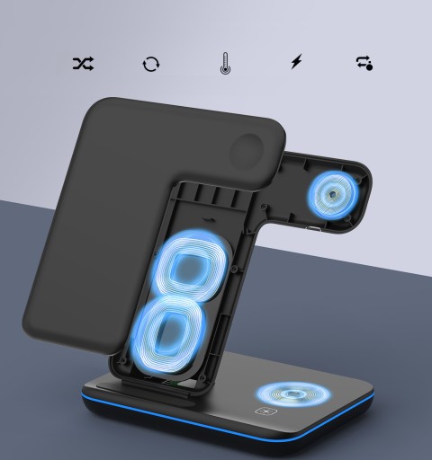 - 3w1: Umożliwia jednoczesne ładowanie trzech urządzeń: smartfona, smartwatcha i słuchawek bezprzewodowych ładowanych bezprzewodowo