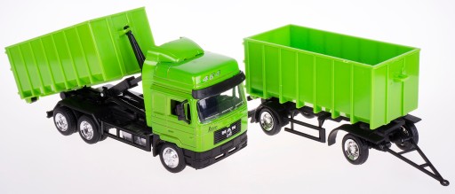 Model ciągnika MAN F2000 z ramieniem rozładunkowym z hakiem + dwa otwarte kontenery wykonany jest w skali 1:43 firmy NEWRAY.