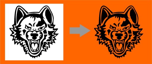 Nasze naklejki ploterowe nie posiadają zbędnego tła. Wzór naklejki, napis przenosi się za pomocą folii transferowej którą po naklejeniu należy usunąć. Naklejką jest tylko to co widać na rysunku w kolorze innym niż biały (przeważnie wzory przedstawiamy czarnym kolorem). To co jest wewnątrz naklejki przedstawione na rysunku na biało po naklejeniu będzie w kolorze oklejanej powierzchni. Przykład poniżej, po lewo naklejka przed naklejeniem po prawo po naklejeniu