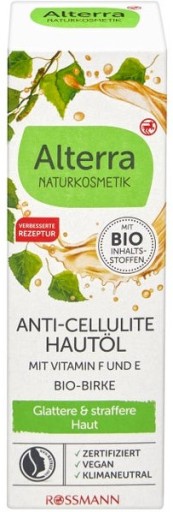 Wygładzający skórę antycellulitowy olejek do skóry Alterra został opracowany, aby zapobiegać widocznym objawom cellulitu. Skuteczna formuła pielęgnacyjna z naturalnymi ekstraktami z liści z brzozy BIO i alg z gatunku skrzydlicy jadalnej, jak również witalizującymi olejkami z limonki i grejpfruta szybko się wchłania i intensywnie nawilża skórę, która staje się jędrniejsza, elastyczniejsza i gładsza.***