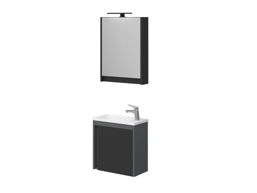 Oba elementy zestawu są wykonane z płyty laminowanej i lakierowane kolor szary głęboki mat, co nadaje im eleganckiego wyglądu i sprawia, że idealnie komponują się z różnymi aranżacjami łazienek.