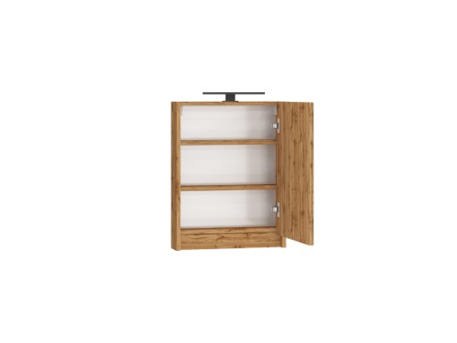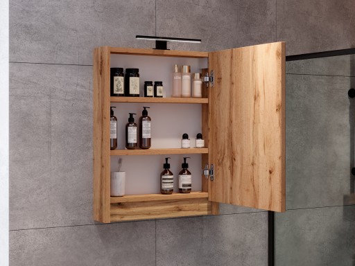 Szafka z lustrem posiada jedne drzwiczki z funkcją cichego domykania, Lustro zamontowane na froncie drzwiczek zapewniają wygodę podczas codziennego użytkowania.
