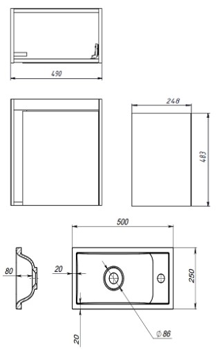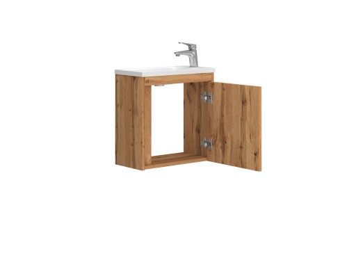 Szafka z umywalką ze sztucznego kamienia. Wyposażona jest w jedne drzwiczki z funkcją cichego domykania, które gwarantują komfort użytkowania. Wnętrze szafki jest przestronne i oferuje dużo miejsca na przechowywanie różnych przedmiotów łazienkowych, takich jak kosmetyki środki czystości czy ręczniki.