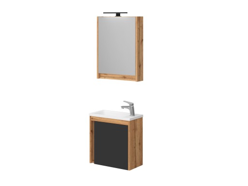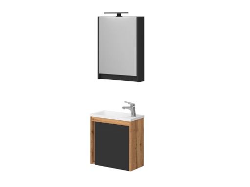 Ważną cechą zestawu, jest oświetlenie LED. Czarna stylowa lampa LED o mocy 3,3W z zasilaniem 230V. Oświetlenie LED w szafce z lustrem sprawia, że zestaw jest nie tylko praktyczny, ale również bardzo estetyczny i nowoczesny.