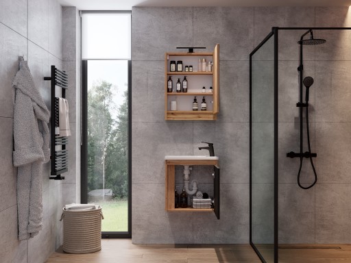 Oba elementy zestawu są wykonane z płyty laminowanej, co nadaje im eleganckiego wyglądu i sprawia, że idealnie komponują się z różnymi aranżacjami łazienek.