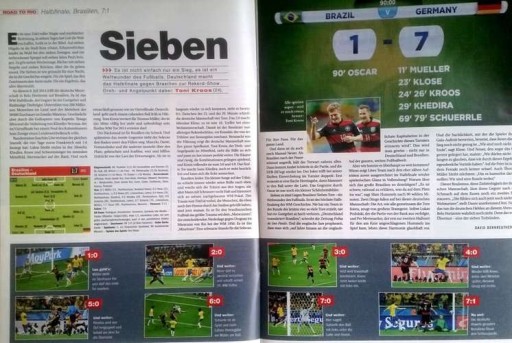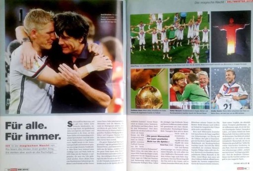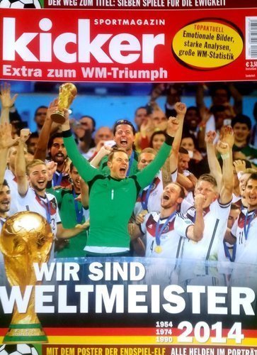 Opis: Specjalne wydanie niemieckiego magazynu "kicker" przygotowane z okazji wywalczenia przez piłkarską reprezentację Niemiec mistrzostwa świata podczas mundialu w Brazylii w 2014 roku. W publikacji zamieszczono obszerne relacje ze wszystkich siedmiu meczów niemieckiej drużyny w tym turnieju, efektowne zdjęcia prezentujące pamiętne dla Niemców momenty w finałach MŚ 2014, dwa plakaty reprezentacji Niemiec, teksty o drużynie, piłkarzach i trenerze Joachimie Loewie, wywiady (Miroslav Klose, Lotthar Matthaeus, Sepp Maier, Horst Eckel), przypomnienie poprzednich triumfów Niemców w finałach MŚ (1954, 1974, 1990) oraz teksty i statystyki prezentujące poszczególnych piłkarzy niemieckiej drużyny. Magazyn jest napisany w języku niemieckim.