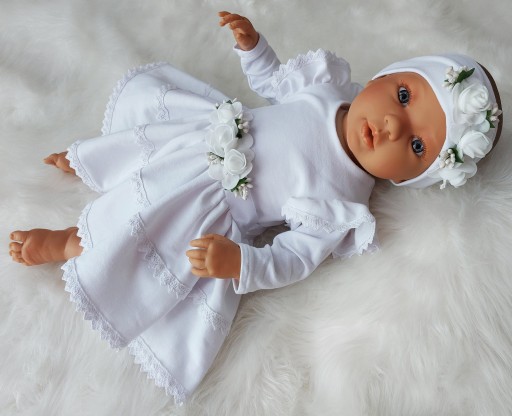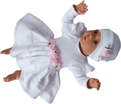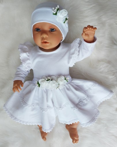 Sukieneczka wykonana z białej dzianiny bawełnianej, wykończona piękną koronką bawełnianą, zapinana z tyłu na zatrzaski, zawiązywana szarfą ozdobioną różyczkami