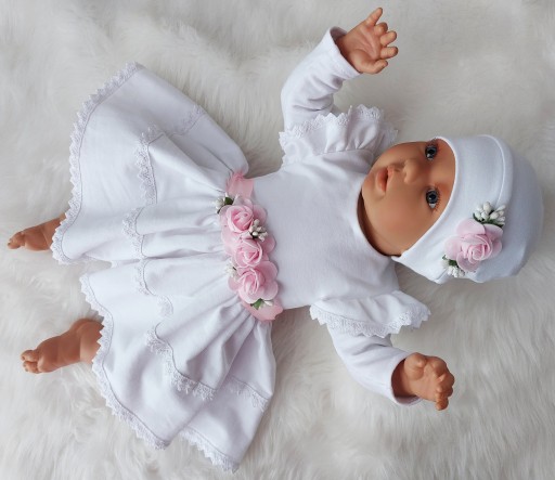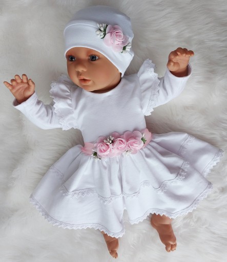 Sukieneczka wykonana z białej dzianiny bawełnianej, wykończona piękną koronką bawełnianą, zapinana z tyłu na zatrzaski, zawiązywana szarfą ozdobioną różyczkami