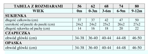 - Istnieje możliwość skompletowania innych rozmiarów poszczególnych części kompletu ( np. sukienka rozmiar 68, a płaszczyk rozmiar 62 itp.)