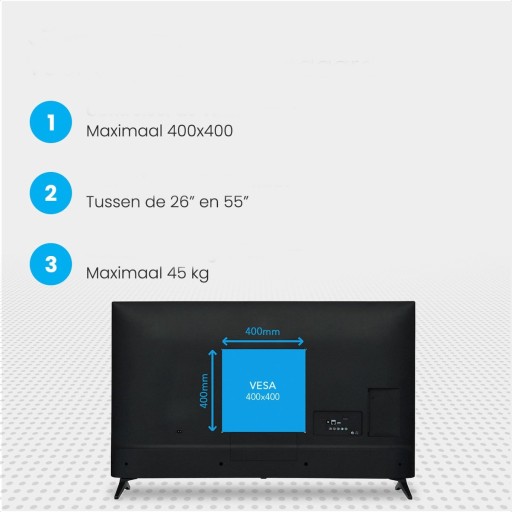 Podstawa pod telewizor Auronic jest odpowiednia dla telewizorów o przekątnej od 26” do 55” różnych marek. Uchwyt ścienny ma wiele różnych konfiguracji VESA. Sprawdź specyfikacje poniżej, aby sprawdzić, czy Twój telewizor jest odpowiedni!