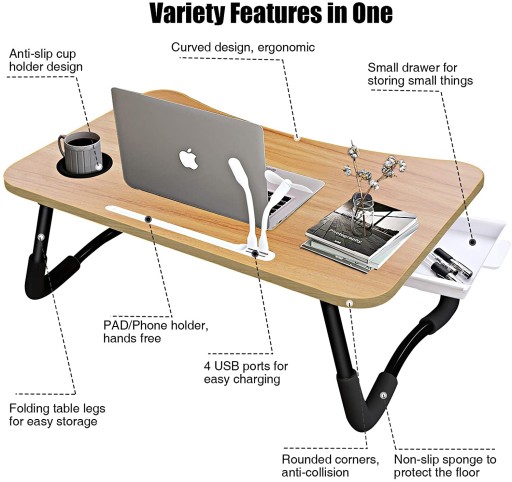 Składany Stolik na laptopa, składany stolik na notebooka z portami ładowania USB 4, szufladą plus gniazdo na kubek