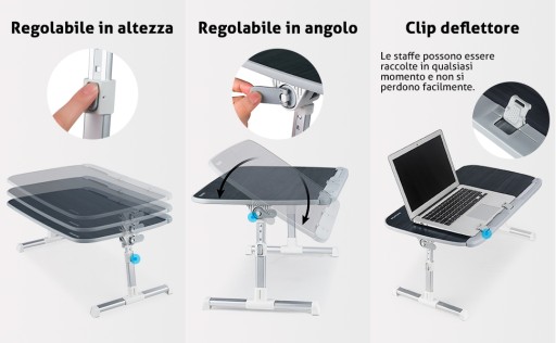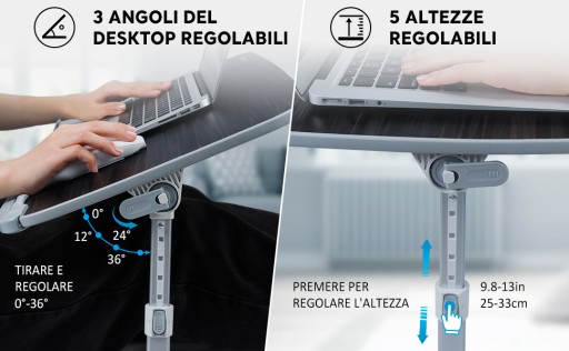 - ŁATWY W UŻYCIU - W pełni zmontowane, dwa samoblokujące przyciski po każdej stronie umożliwiają szybką zmianę wysokości, nogi można regulować na 5 różnych wysokościach (regulowane od 25 cm do 33 cm), a do regulacji kąta można użyć dwóch zacisków powierzchni, powierzchnię można regulować pod 3 różnymi kątami (od 0 do 30 °). Paski zapobiegają zsuwaniu się, a półka na spodzie zabezpiecza laptopa podczas przechylania, zapewniając wygodę i stabilność